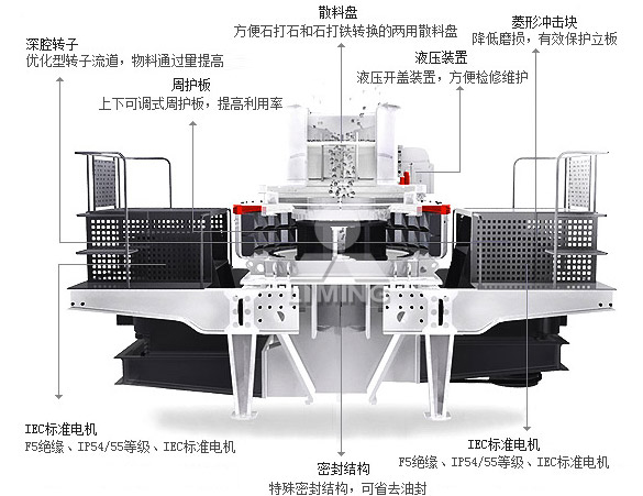 物料可直接進(jìn)入轉(zhuǎn)子經(jīng)離心加速后拋出,與周護(hù)板碰撞破碎,也可通過散料盤分流,一部分從四周散落,另一部分進(jìn)入轉(zhuǎn)子加速后沖出與周圍散落物料發(fā)生碰撞、摩擦,并與周護(hù)板發(fā)生撞擊、反彈,形成循環(huán)打擊。隨著破碎進(jìn)行,小顆粒物料在周護(hù)板附近逐漸形成料層幕,提高破碎效果并對(duì)設(shè)備起到保護(hù)作用,符合規(guī)格的機(jī)制砂產(chǎn)品從下端出料口排出。