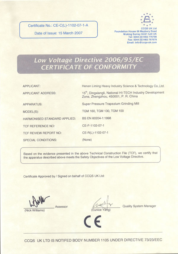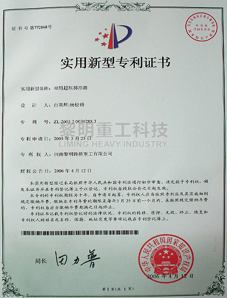 - 雙用超壓梯形磨粉機專利號:ZL 200520030288.3 >>查看證書