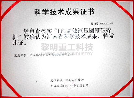 - HPT高效液壓圓錐破碎機獲河南省科學技術(shù)成果 >>查看證書