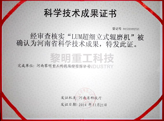 - LUM超細立式輥磨機獲河南省科學技術(shù)成果 >>查看證書