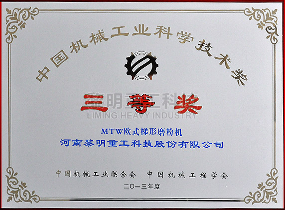 - MTW歐版梯形磨粉機中國機械工業(yè)科學技術(shù)獎 >>查看證書