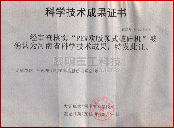- PEW歐版顎式破碎機獲河南省科學技術(shù)成果 >>查看證書