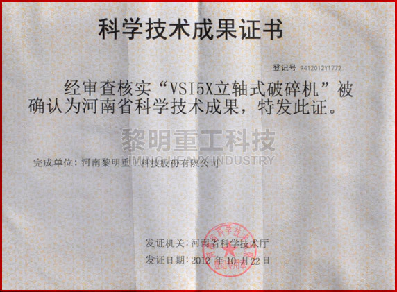 - VSI5X立軸式破碎機獲河南省科學技術(shù)成果 >>查看證書