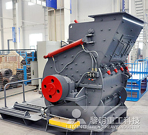 主機(jī)通過電機(jī)、三角皮帶帶動(dòng)主軸,從而使轉(zhuǎn)子旋轉(zhuǎn),錘頭受到旋轉(zhuǎn)時(shí)所產(chǎn)生的離心力向四周伸開,大塊物料從進(jìn)料口進(jìn)入破碎腔之后,便被高速運(yùn)動(dòng)的錘子擊碎。破碎合格的物料則由下部有縫隙的蓖條排出,不合格的則留在破碎腔內(nèi),被錘子和承擊鐵塊反復(fù)作用,直至能夠合格排出。