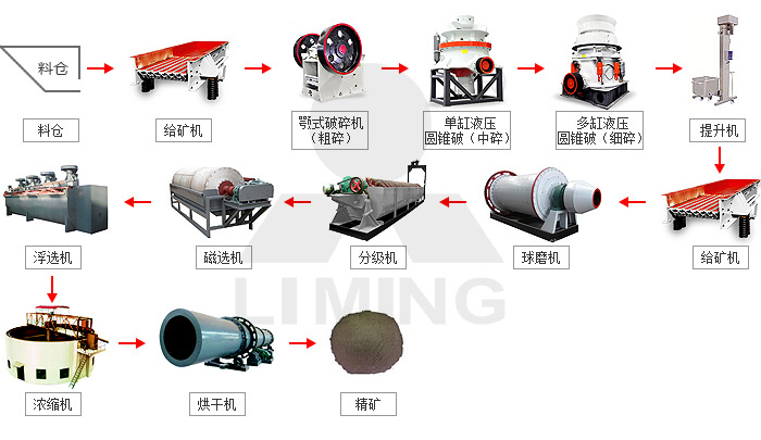 選礦生產(chǎn)線一般分為磁選法和浮選法兩種不同的選取作業(yè)方式,具體流程如下:給礦機(jī)將開采的礦石送入顎式破碎機(jī)進(jìn)行初步破碎,粗破后的礦石由圓錐破碎機(jī)破碎至合理細(xì)度后經(jīng)由提升機(jī)、給礦機(jī)均勻送入球磨機(jī)進(jìn)行粉碎、研磨。研磨出的礦石進(jìn)入分級(jí)機(jī)內(nèi),分級(jí)機(jī)借助固體顆粒比重不同在液體中沉淀速度不同的原理,對(duì)礦石混合物進(jìn)行洗凈、分級(jí)。經(jīng)過(guò)洗凈和分級(jí)的礦物混合料在經(jīng)過(guò)磁選機(jī)時(shí),由于各種礦物的比磁化系數(shù)不同,經(jīng)由磁力和機(jī)械力將混合料中的磁性物質(zhì)分離開來(lái)。經(jīng)過(guò)磁選機(jī)初步分離后的礦物顆粒再被送入浮選機(jī),根據(jù)不同的礦物特性加入不同的藥物,使得所要的礦物質(zhì)與其他物質(zhì)分離開。在所要的礦物質(zhì)被分離出來(lái)后,因其含有大量水分,須經(jīng)濃縮機(jī)的初步濃縮,再經(jīng)烘干機(jī)烘干,即可得到干燥的礦物質(zhì)。