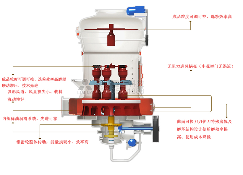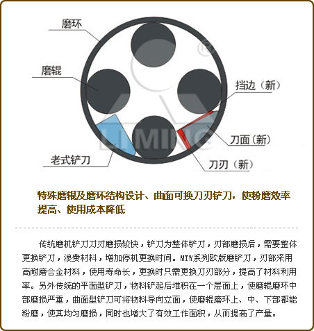 曲面可換刀刃鏟刀,特殊磨輥及磨環(huán)結構設計使粉磨效率提高、使用成本降低