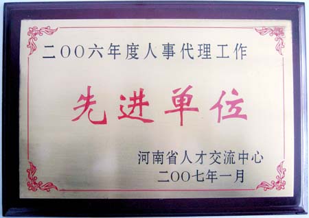 2007年1月28日,河南省人事代理先進單位表彰大會在河南省“戰(zhàn)友大酒店”隆重召開,根據(jù)《關(guān)于表彰2006年度人事代理工作先進單位和先進工作才的決定》(豫人才發(fā)〔2007〕3號),我公司繼2004年度、2005年度兩次被評為“河南省人事代理先進單位”之后,再獲此殊榮。公司人力資源部喬經(jīng)理等同志被表彰為先進工作者。