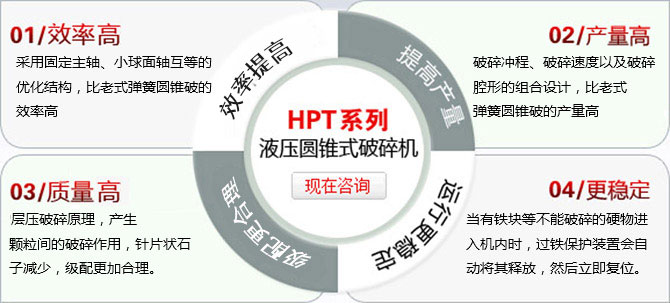 3、HPT圓錐破對腔型和沖程進行了重新實驗設(shè)計,更適合破碎河卵石、玄武巖、鐵礦石等堅硬物料,產(chǎn)量比普通彈簧圓錐破提高。