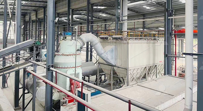 第二階段:磨粉破碎后的重晶石小塊物料經(jīng)提升機送至料倉,再經(jīng)振動給料機將其均勻定量的送入磨機研磨室內(nèi)進行研磨。