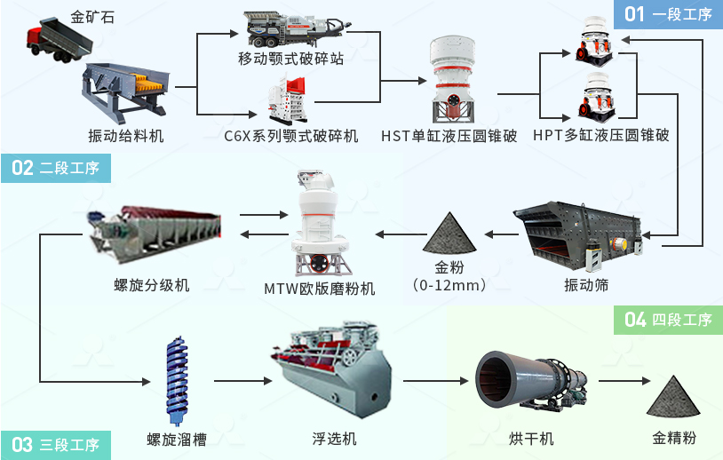 金礦石加工生產(chǎn)工藝主要包括:破碎、磨礦、選礦三個過程: