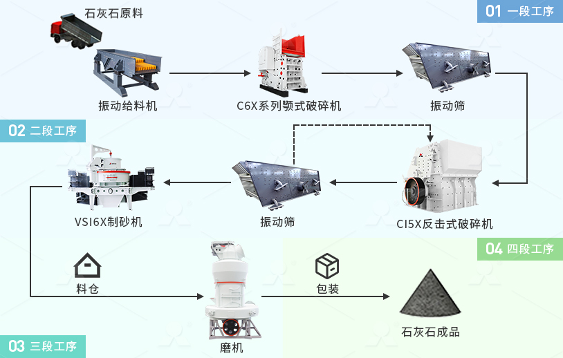 石灰石或石灰?guī)r資源豐富,原礦品位一般能滿足各工業(yè)部門的要求。因此,一般只需要進行簡單的洗礦,不需要采用復雜的選礦工藝進行提純。石灰石的加工主要是粉碎、分級以及生產生石灰、熟石灰、沉淀碳酸鈣、超微細(納米)碳酸鈣、二氧化碳等。石灰石一般采用干式粉碎工藝,對于冶金、道路用石灰石,將礦石破碎篩分后即可。對于細粉產品的生產,礦石經顎式破碎機、反擊式破碎機或圓錐式破碎機等破碎后直接用雷蒙磨粉磨,產品細度100-325目,具體加工流程如下: