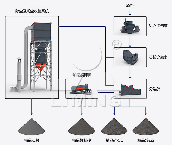 VUS砂石同出系統(tǒng)采用干法生產(chǎn)工藝,主要由上料輸送系統(tǒng)、制砂整形篩分系統(tǒng)、除塵系統(tǒng)、石粉存儲(chǔ)系統(tǒng)和電氣控制系統(tǒng)組成。