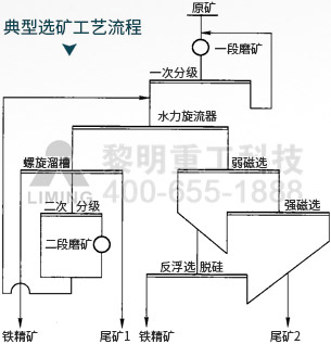 赤鐵礦選礦技術(shù) 赤鐵礦典型的選礦工藝流程有三種:連續(xù)磨礦―弱磁―強磁―陰離子反浮選、階段磨礦―粗細(xì)分選―重―磁―陰離子反浮選和階段磨礦―粗細(xì)分選―磁―重―陰離子反浮選。