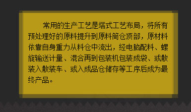 常用的生產(chǎn)工藝是塔式工藝布局,將所有預(yù)處理好的原料提升到原料筒倉頂部,原材料依靠自身重力從料倉中流出,經(jīng)電腦配料、螺旋輸送計量、混合再到包裝機包裝成袋、或散裝入散裝車、或入成品倉儲存等工序后成為產(chǎn)品。