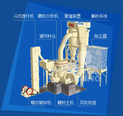 大塊非金屬礦經(jīng)顎式破碎機破碎后,由斗式提升機送至儲料倉,通過電磁振動給料機均勻連續(xù)地送入磨粉機主機內(nèi)研磨,研磨后的粉末在鼓風機的作用下吹向選粉機進行分選。符合細度的非金屬礦粉由管道輸送到儲料倉;不合格的粒子重回磨粉機內(nèi)研磨。整個系統(tǒng)在負壓狀態(tài)下運行,粉塵不外溢,從而保護了周邊環(huán)境。若經(jīng)脈沖除塵器過濾,環(huán)保效果更佳。