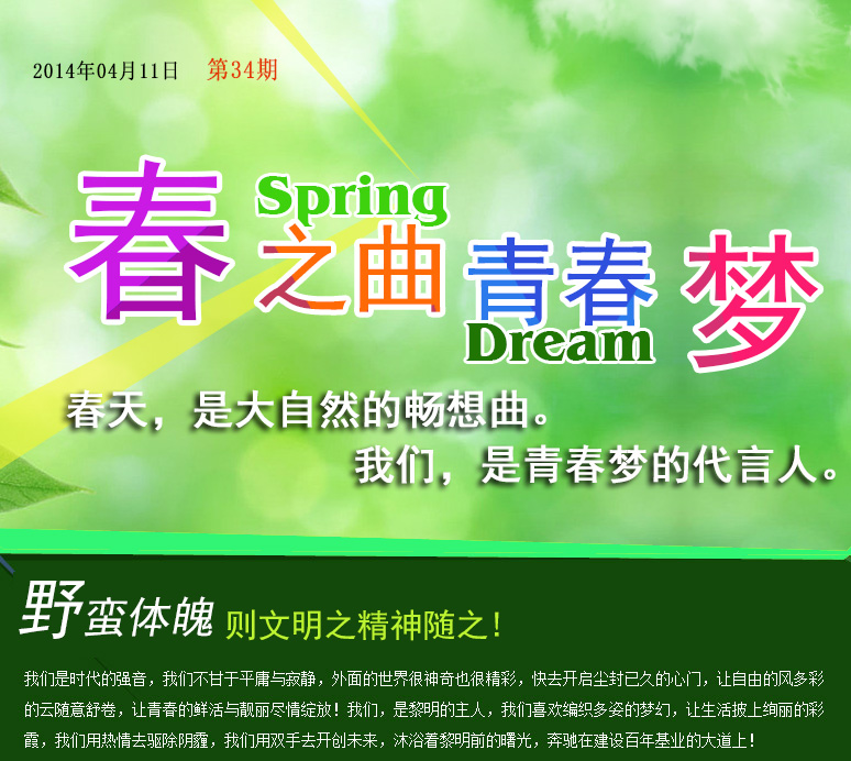 我們是時(shí)代的強(qiáng)音,我們不甘于平庸與寂靜,外面的世界很神奇也很精彩,快去開啟塵封已久的心門,讓自由的風(fēng)多彩的云隨意舒卷,讓青春的鮮活與靚麗盡情綻放!我們,是黎明的主人,我們喜歡編織多姿的夢幻,讓生活披上絢麗的彩霞,我們用熱情去驅(qū)除陰霾,我們用雙手去開創(chuàng)未來,沐浴著黎明前的曙光,奔馳在建設(shè)百年基業(yè)的大道上!