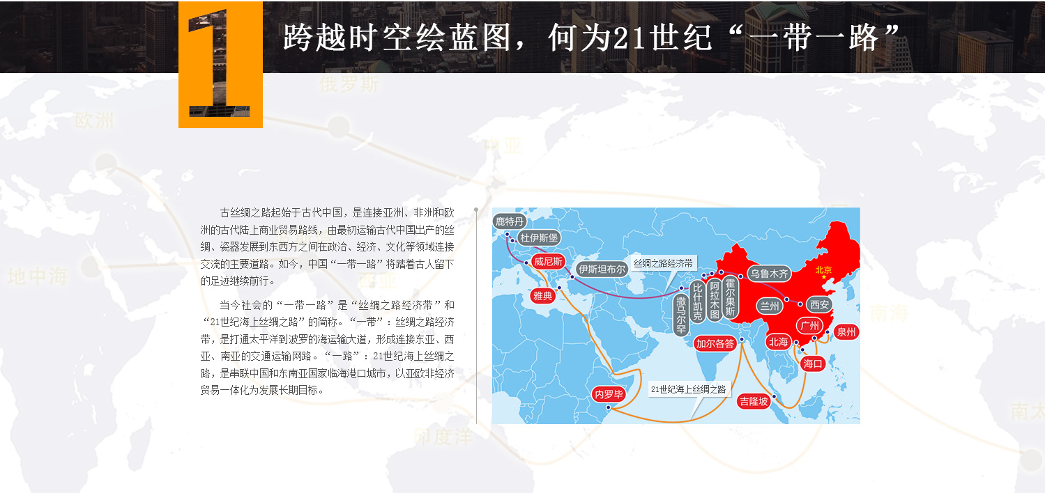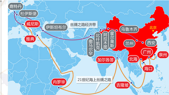當(dāng)今社會(huì)的“一帶一路倡議”是“絲綢之路經(jīng)濟(jì)帶”和 “21世紀(jì)海上絲綢之路”的簡(jiǎn)稱。“一帶”:絲綢之路經(jīng)濟(jì)帶,是打通太平洋到波羅的海運(yùn)輸大道,形成連接?xùn)|亞、 西亞、南亞的交通運(yùn)輸網(wǎng)路。“一路”:21世紀(jì)海上絲綢之路,是串聯(lián)中國(guó)和東南亞國(guó)家臨海港口城市,以亞歐非經(jīng) 濟(jì)貿(mào)易一體化為發(fā)展長(zhǎng)期目標(biāo)。