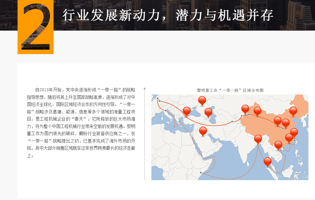 自2013年開(kāi)始,黨中央逐漸形成“一帶一路倡議”的戰(zhàn)略指導(dǎo)思想,隨后將其上升至國(guó)家戰(zhàn)略高度,逐漸形成了對(duì)中國(guó)經(jīng)濟(jì)全球化、國(guó)際區(qū)域經(jīng)濟(jì)合作的方向性引導(dǎo)。“一帶一路倡議”戰(zhàn)略涉及基建、能源、信息等多個(gè)領(lǐng)域的海量工程項(xiàng)目,是工程機(jī)械企業(yè)的“春天”,它所釋放的巨大市場(chǎng)潛力,將為整個(gè)中國(guó)工程機(jī)械行業(yè)帶來(lái)發(fā)展機(jī)遇。黎明重工作為國(guó)內(nèi)知名的破碎、磨粉行業(yè)裝備供應(yīng)商之一,在“一帶一路倡議”戰(zhàn)略提出之初,已基本完成了海外市場(chǎng)的開(kāi)拓,其中大部分銷售區(qū)域就在這條世界跨度最長(zhǎng)的經(jīng)濟(jì)走廊上。